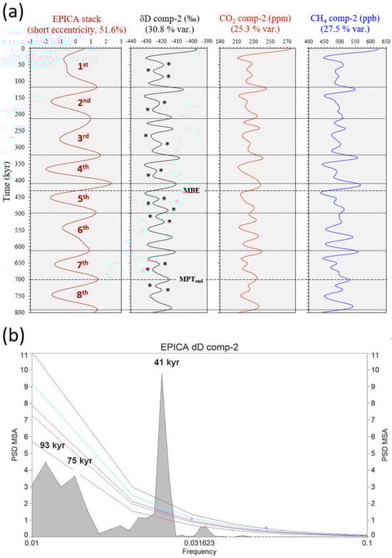 (a) EPICA dominant short eccentricity stack (51.6% variance) and related cycles defined on maxima (black horizontal lines) and numbered from 1st to 8th (left), compared with δD, CO2, CH4 SSA-component-2 time series (obliquity signal embedded in a weak short eccentricity). Asterisks on δD comp-2 (not shown on the other comp-2s) exhibit two or three low-amplitude 41 kyr obliquity peaks (glacial/interglacial) embedded in a weak ~93/75 kyr framework after the MPT, a possible observational reminiscent of the ‘obliquity-cycle skipping’ [21]; (b) FFS of the δD comp-2, very similar to the CO2 and CH4 signals (not shown), showing a dominant 41 kyr cycle embedded in a weak ~93/75 kyr framework. Coloured lines are first-order autoregressive AR(1) curves (50%, 90%, 95%, 99%, and 99.9% significance levels). MBE = Mid-Brunhes Event; MPT = Mid-Pleistocene transition. Data from Viaggi [26].