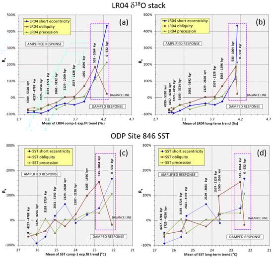 Response sensitivity analysis of Pliocene–Pleistocene orbital components (blue: short eccentricity, brown: obliquity, green: precession) of (a,b) global LR04 δ18O and (c,d) equatorial ODP Site 846 SST as a function of the long-term mean climate state (left x-axis: exponential trend; right x-axis: long-term trend). The data are calculated from arbitrary time segments binned at 532 kyr. The balance line (0%) indicates that the variance of response matches the variance in forcing, suggesting a self-sustained climate system, which is only paced by orbital cycles. Values much larger than zero would indicate a reinforcement of the signal response. Note the different magnitude of amplification between the global LR04 δ18O (up to ~440%) and the equatorial Site 846 SST (up to ~180%) records. Negative Rs shows a response variance lower than orbital forcing, suggesting a damping mechanism for the climate system. The fuchsia box highlights the strong inverse coupling between obliquity damping and short eccentricity/precession amplification during post-MPT time. Data from Viaggi [8].