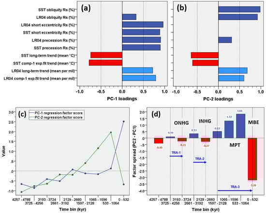 Pliocene–Pleistocene standardised PCA model for LR04 δ18O/Site 846 SST orbitals Rs and the mean climate state by time binned at 532 kyr: (a) PC-1 loadings; (b) PC-2 loadings; (c) PCs regression factor score (57.7% and 36.9% variance, respectively); (d) PCs factor score spread (PC-2–PC-1). Positive spread (blue bar): high obliquity vs. low short eccentricity/precession Rs. Negative spread (red bar): low obliquity vs. high short eccentricity/precession Rs. ONHG (Onset of the Northern Hemisphere Glaciation), INHG (Intensification of Northern Hemisphere Glaciation), MPT (Mid-Pleistocene Transition) and MBE label time bins containing these events. Blue arrows: transition patterns (TRA-1, 2, 3) of positive to negative factor spread including ONHG (TRA-1), INHG (TRA-2), and MPT/MBE (TRA-3). Data from Viaggi [8].