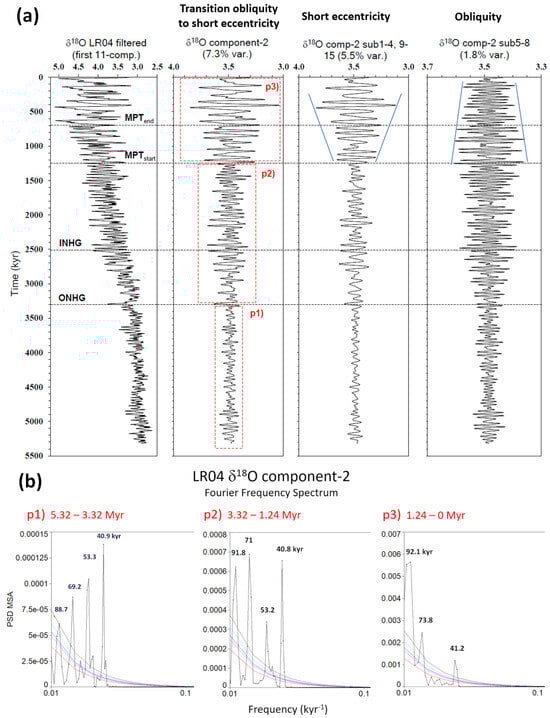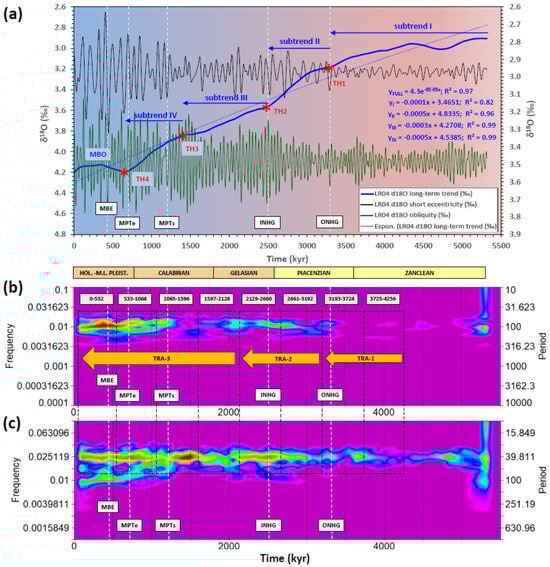 Most of the hypotheses put forward for the origin of the MPT invoke certain internal changes in the climate system in response to long-term cooling, possibly induced by a decrease in atmospheric CO2 [2,28,29,30,31,32,33,34] along with the concurrent northward geodynamic migration of Greenland and North America, favouring a net accumulation of continental Arctic ice [35,36]. Viaggi [8] reinforced the notion of a geo-tectonic control on the long-term composition of the atmospheric greenhouse gases (GHGs) (seafloor spreading rate, explosive volcanic activity, orography and erosion, paleogeographic configuration, oceanic paleocirculation, and ocean fertilisation), and highlights four phases (subtrends I, II, III, IV) of the progressive lowering of the average temperatures and ice-volume growth, triggered by long-term changes in the atmospheric composition. However, these interesting hypotheses might explain the origin of the Plio–Pleistocene long-term cooling, but it remains unclear what kind of ‘response’ to this cooling has to deal with the MPT origin and its observational features. Indeed, in the context of an increasing power of obliquity nominal forcing and decrease in eccentricity nominal power [37,38] during the MPT and post-MPT period, it remains unclear why obliquity cycles that dominated the pre-MPT time with an incisive ‘ice-killing’ action [5,8,22,25], gradually became less effective in preventing the prolonged survival of the ice sheet through possible obliquity-cycle skipping [21,22] and obliquity response damping, associated to a strong short eccentricity response [8,26].