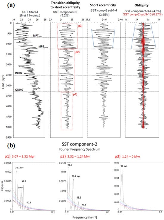 An Antarctic SSA signal structural observation related to the eccentricity–obliquity link can be seen in Figure 4. δD, CO2, and CH4 component-2 signals exhibit two or three low-amplitude 41 kyr obliquity peaks (glacial/interglacial) embedded in a weak ~93/75 kyr framework [26]. In contrast, the obliquity maxima associated with glacial terminations appear more pronounced. These features are similar to the shapes shown by Viaggi [8] for the global δ18O and equatorial SST components 3–4 during the MPT, and may be further evidence of an obliquity attenuation phenomenon. This suggests a connection between short eccentricity and obliquity, a possible observational reminiscent of the ‘obliquity-cycle skipping’ model [21,22].