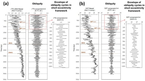 According to the Milankovitch theory, obliquity is a key component in high-latitude insolation. High obliquity significantly amplifies the seasonality, especially in the polar areas, thereby creating cold winters and hot summers with maximal melting. This prevents high-latitude ice accumulation [46]. Huybers [50] argued that the integrated summer (June-July-August, JJA) insolation between 30° and 70° N, which is dominated by the 41 kyr obliquity signal, is more representative of summer melt compared to the 65° N JJA insolation, which is dominated by precession. Raymo and Nisancioglu [51] proposed that the strong obliquity signal imprinted on the Ice Age record is generated by the exertion of controlled meridional temperature gradients on the poleward transport of moisture. As obliquity decreases, cooling at high latitudes occurs and the gradient of insolation heating between high and low latitude increases, both of which promote ice-sheet growth. Similar results were obtained by Mukhin et al. [17]. They construct a Bayesian data-driven model from an LR04 δ18O record that could account for the main factors that may potentially impact the Pleistocene climate. The only insolation forcing that matters in the Pleistocene climate is that the meridional gradient of insolation is dominantly affected by obliquity oscillations. The insolation gradient was regarded as the driving force for the 41 kyr climate cycles during the pre-MPT epoch (from 3 Ma to 0.8 Ma) through the atmospheric meridional heat and moisture fluxes that were modulated [17]. Moreover, an assessment of eleven radiometrically dated terminations suggests that obliquity exerted a persistent influence on ice age terminations since the MPT [52]. The key role of obliquity on the Earth’s climate system is also attested by its largest quantitative impact on the global LR04 δ18O record during the Plio–Pleistocene, whose variance is estimated to be 9.9% with only 2.0% precession [8]. Similar results were obtained for the SST record of equatorial Site 846, where obliquity carries 5.5% variance and a precession of 1.6%. The relevant action of obliquity in preventing the long life of ice sheets during the Plio–Pleistocene pre-MPT period was referred to as obliquity’s ‘ice killing’ by Viaggi [8].