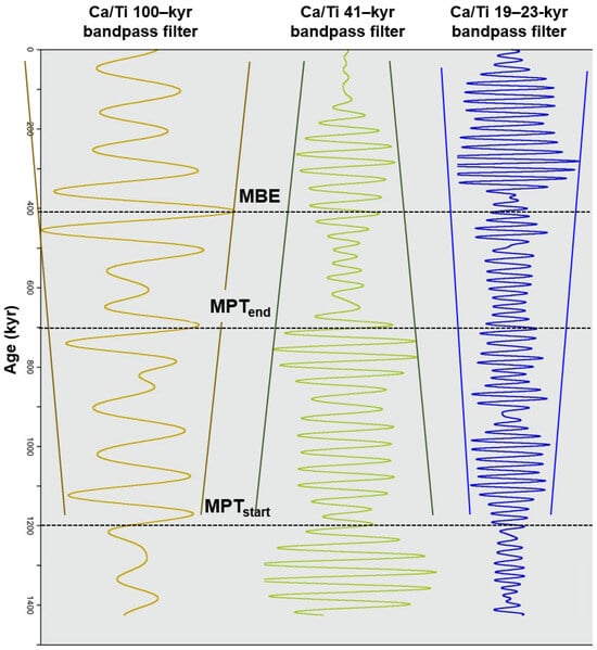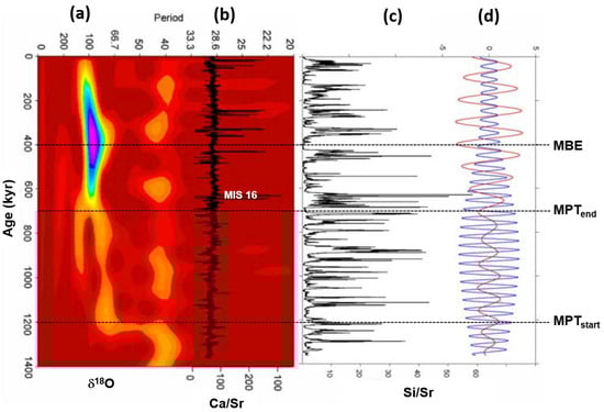 Understanding the Mid-Pleistocene Transition has remained one of the most fascinating and unresolved question in paleoclimatology over the course of several decades of research. The MPT is marked by a gradual shift in periodicity from 41 kyr to ~100 kyr and a progressive increase in the amplitude and ‘saw-tooth’ shape of climate oscillations. This scientifically challenging phenomenon represents a key element to constrain the mechanisms that governed the climate system in the past, and it remains a fundamental learning lesson also for present-day climate and the associated changes. The MPT began at approximately 1.2 Ma [1,2,3] and marks the beginning of the classical Pleistocene ‘Ice Ages’ when major glaciations developed over North America, northern Europe, and the Alps. The final stage of the MPT at approximately 0.7 Ma [2] marks the start of the dominant ~100 kyr climate response, a paleo-climatological paradox considering the extremely low energy of the eccentricity insolation changes [2,4,5,6,7]. Indeed, new insights into the nonlinear dynamics of the climate indicate short eccentricity response amplification over a nominal solution of +400% (global δ18O) and +180% (equatorial Pacific sea surface temperature, SST) during the Mid-Late Pleistocene, which are linked with the long-term mean icy state (δ18O and SST exponential trends) [8]. This shift in periodicity, amplitude, and asymmetry of climate responses towards the Late Pleistocene evinces the fundamental changes in the dynamics of the climate system mentioned in the literature; however, the cause of these features still remains poorly understood [2,9,10,11,12]. In the following lines, we critically examine some of the many models and hypotheses related to the MPT, referring to the cited literature for discussion and further details.