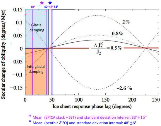 Climate friction by obliquity–oblateness feedback is dissipative feedback between obliquity variations and climate, which may cause a secular drift of the spin axis [37]. Glacial and interglacial conditions drive the redistribution of the ice/water mass and the isostatic adjustment to surface loading, affecting the dynamical ellipticity of the Earth (oblateness). Because both the Earth’s ice load history and viscoelastic structure of the solid Earth are not strongly constrained, it is difficult to produce accurate predictions of the coupled response of the entire system, which depends on both oblateness changes and phase lag estimates of the ice volume in the obliquity band [37,45,46,47,48]. Therefore, simplified assumptions have to be made to evaluate the magnitude and the direction (positive or negative) of the obliquity secular change. Specifically, based on the analysis of benthic δ18O records, Levrard and Laskar [46] estimated a positive mean secular obliquity change of 0.01° Ma−1 during the glaciation periods of the last 3 Ma. However, the ODH requires a negative secular change in obliquity during the last 1.2 Ma to explain the obliquity reduction on its maxima (interglacials), i.e., during the most critical phase to promote long-lasting feedback-induced ice growth in the short eccentricity band. The obliquity–oblateness feedback is still an understudied phenomenon that needs further investigation [8], while the anomalous decline in obliquity response power during the Mid-Late Pleistocene [8,22,25,49] and the detailed analysis of the Plio–Pleistocene long-term cooling trend [8] are new insights that need to be placed in the context of the MPT origin. The obliquity–oblateness feedback could be the latent physical mechanism connecting obliquity damping with the short eccentricity amplification.