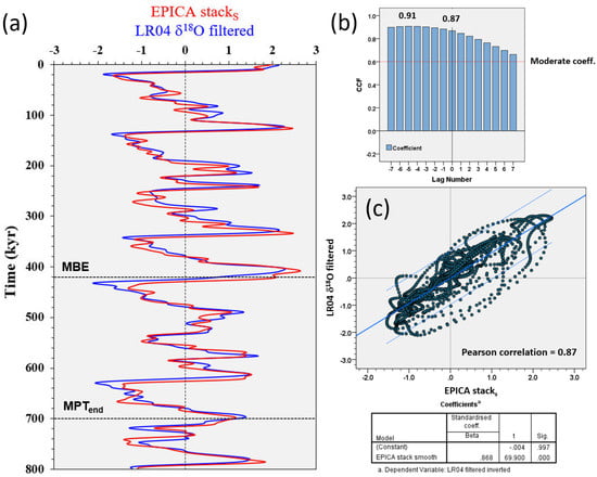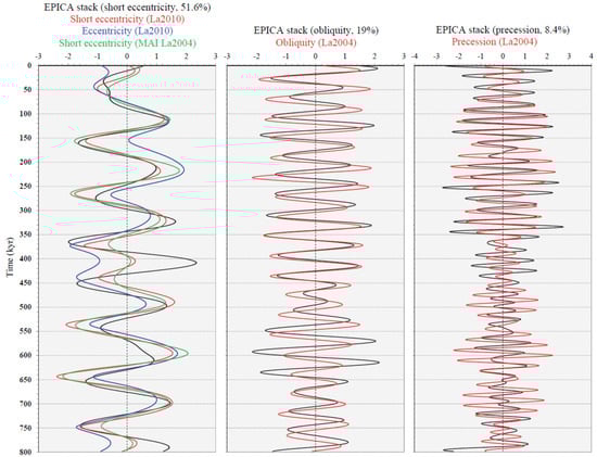 The δD, CO2, CH4 records were acquired by the European Project for Ice Coring in Antarctica (EPICA) for the last 800 kyr [55,56,57,58]. The EPICA time series provided by Past Interglacials Working Group [59] were recalibrated based on the robust AICC2012 age model, which was built by combining glaciological inputs and data constraints, including a wide range of relative and absolute gas and ice stratigraphic markers [60]. The 0.5 kyr resampled EPICA orbital components isolated by SSA [26] and recalibrated on the AICC2012 age model [59] were applied in the present work. The EPICA stack is the mean signal among the highly covariant standardised δD, CO2, and CH4 SSA-filtered records [26], and the EPICA smoothed stack (stacks) is the Savitzky–Golay filtered signal by a 4-order least squares polynomial fitting across a moving window of 15. This is to compensate for the higher resolution of the original EPICA record. The δD proxy depends on Antarctic site temperatures derived from the ratios of water isotopes in ice cores [61]. CO2 and CH4 concentrations were determined directly from measurements in the air within ice cores [56,57]. The CH4 content results from changes in wetlands in the tropics and high northern latitudes [57,59]. Thus, ice core CH4 may be viewed as a signal integrating parts of the northern hemisphere terrestrial biosphere [56,57,59].