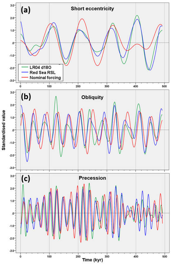 As in the case of EPICA, the RSL data were rescaled with respect to the Plio–Pleistocene variance to provide a rough estimate on a long time frame and compare the results (calculation base of 23.6%), which were found to be largely similar to those of EPICA (Table 3). Indeed, as expected in a post-MPT record, the RSL short eccentricity is primarily responsible for the variance in the Red Sea record, being rescaled to 14.5%. Again, this strength is very high compared to the global δ18O of 6.5% [8]. The RSL obliquity signal is approximately equivalent to a Plio–Pleistocene rescaled variance of 3.1%. In contrast to the short eccentricity, this value is clearly too low compared to the LR04 δ18O of 9.9%, corroborating the RSL obliquity damping evidence, similar to the EPICA record. The Red Sea RSL precession signal corresponds to 2.8% rescaled variance, which is slightly amplified compared to δ18O.