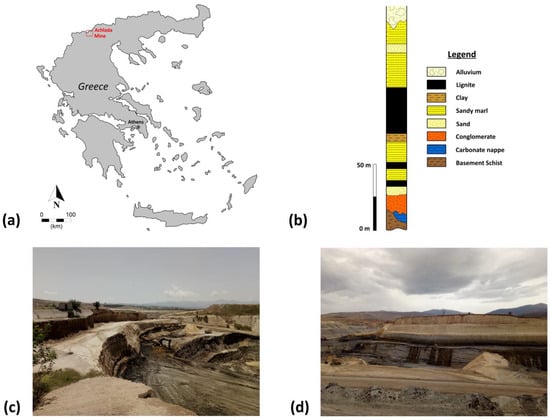 (a) Location of Achlada mine, (b) lithological column of the Florina Basin (created with base [28]), and (c,d) photos of the mine.
