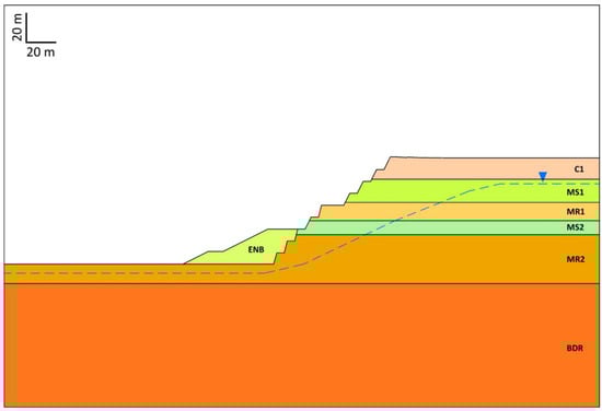Slope geometry. C1: upper silty/marly clay zone, MS1: upper sand/pebble sandstone zone, MR1: intermediate silt/silt loam zone with the presence of xylite interbeds, MS2: lower sand/marly sandstone zone, MR2: lower silt/silt loam zone with the systematic presence of xylite, BDR: underlying marl formation, and ENB: counterweight. The upside-down triangle and the blue dashed line indicate the water table.