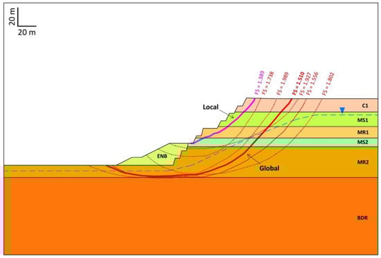 The Morgenstern–Price method (M-P) was applied for the slope stability analysis using the GeoSlope software [37]. The M-P method is the most appropriate and comprehensive approach for evaluating the stability of a slope that comprises alternating geological formations.