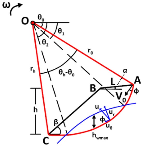 where is the angular velocity. The terms and denote the log-spiral radii and and the angles, shown in Figure 5.