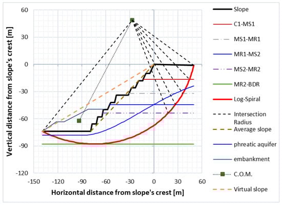 For the stability evaluation and definition of the geometry (location and shape) of the critical failure surface, a modified logarithmic spiral method using the upper-bound theorem was applied. Considering the above restrictions and assuming that the hydrostatic stress in the mass equilibrates the pore water pressure, the stability of the multi-layered slope was calculated using the excel worksheet provided in Supplementary Materials (Geoscience_Upper_Bound_Multilayer_Slope.xlsx). The safety factor was estimated equal to and the crucial slip surface depicted in Figure 7 compares well with the slip surface defined from the limit equilibrium method.