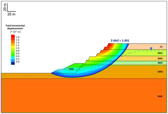 The safety factor was found using the c-phi reduction approach according to the Mohr–Coulomb criterion. The method is based on the reduction in the cohesion () and the tangent of the internal friction angle () of the soil until the failure of the slope occurs. It is noted that the analyses were performed using constant Poisson’s ratios () and Young’s modulus () of the formations, presented in Table 1, and the value of the safety factor, and it was found to be equal to 1.491 (Figure 9).