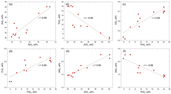 The formula element for zircon is Hf, the only one that demonstrates a positive relationship between the HfO2 and ZrO2 (r = 0.95, Figure 4e) contents. A negative correlation was established for HfO2 with ThO2 (r = −0.86, Figure 4f).