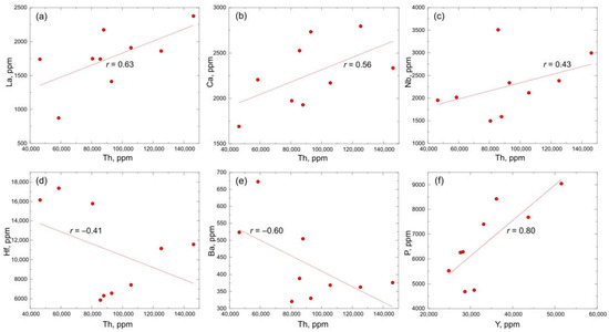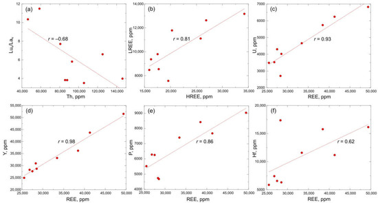 REE is positively correlated with U (r = 0.93, Figure 7c), Y (r = 0.98, Figure 7d), P (r = 0.86, Figure 7e) and Hf (r = 0.62, Figure 7f).