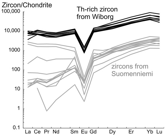 We compared REE distribution spectra for Th-rich zircon with those obtained by LA-ICP-MS for zircon obtained from the rapakivi granites of the Suomenniemi Massif, located at the northeastern flank of the Wiborg Massif, Finland [31]. The total REE value in Suomenniemi zircon is much lower than in Wiborg Th-rich zircon, varying from 475 to 5019 ppm (on average, 1903 ppm). Suomenniemi zircon clearly displays negative Eu-anomaly (Eu/Eu* on average, 0.07) similar in magnitude to Eu-anomaly in Wiborg granites. The pattern of the spectra for HREE is generally consistent with that for zircon from both massifs, except for a low value obtained for zircon from Suomenniemi rapakivi granites (Figure 6). In the LREE range, Suomenniemi zircon shows a wide range of values exceeding chondrite values by two orders of magnitude. Several spectra display a flat LREE distribution spectrum similar to those for Th-rich zircon. Other spectra for Suomenniemi zircon with lower LREE show a fractionated pattern in which LREE becomes more abundant than HREE’s. Th and U (40–250 ppm for both elements) in zircon from Suomenniemi rapakivi granites are common for granites [36]. Its Th/U ratio is much lower than that for Th-rich zircon, varying from 0.7 to 1.4 (on average, 1.1). The Y value in Suomenniemi zircon is 2900 ppm, which is lower by at least one order of magnitude than that in Wiborg zircon (on average, 33,901 ppm, Table 2).