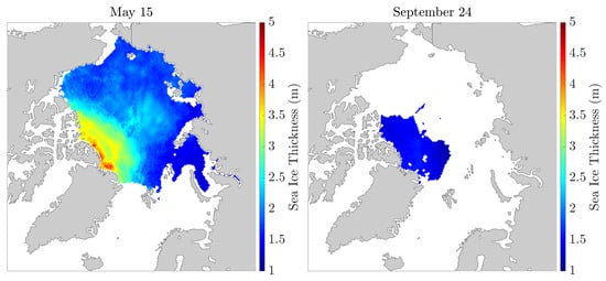 Maxima and minima estimates of the sea ice thickness in the Northern Hemisphere averaged over a 5-year period from 2019 to 2023, derived from the ESA CryoSat-2 Synthetic Aperture Interferometric Radar Altimeter [10].