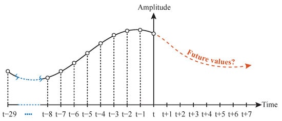 Conceptual representation of multi–horizon forecasting, where the aim is to predict a phenomenon’s state in multiple future time instances (e.g., seven steps ahead).