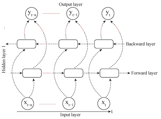 In this work, we use BiLSTMs (see Figure 3). Such a network was first proposed in [40] using a standard recurrent cell. The LSTM cell’s neurons are divided into forward and backward states in such a network. Following this, information from past and future instances can be obtained as forward and backward hidden layers connected to the same output. In comparison with other recurrent neural networks, the BiLSTM’s structure allows it to take into account not only the preceding but also the succeeding context. This aspect also makes it more robust to noise and hence able to make more accurate predictions. Such capabilities make BiLSTMs especially well suited for processing and learning patterns found in the input time series (e.g., SIV) to produce accurate forecasts.