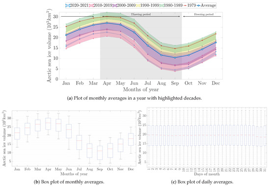 Although similar seasonal patterns are present throughout the time series, another distinction can be made between the years (see Figure 4a). The effects of global warming can be observed, with significant decreases in the volume values from one decade to another. In particular, the lowest annually averaged pan-Arctic SIV was in 2017, whereas the highest was in 1979. Hence, capturing these intra-monthly, monthly, and yearly variations could improve forecasting performance.