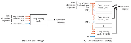 However, the proposed hybrid technique implements the “divide and conquer” strategy, which requires more time for model learning. More specifically, training the hybrid model using this strategy can be seen as equivalent to training the same model multiple times using the “All-in-one” strategy. As seen in Figure 6, this increase in time and complexity is tied with , the number of decompositions (and residual), reflecting the training of the models with partial input data (e.g., an ith IMF with a corresponding time sequence). Nevertheless, the granularity of data (e.g., daily, in the case of this study) and the availability of higher-performance computation devices can enable the successful application of such a forecasting strategy in real-world scenarios.