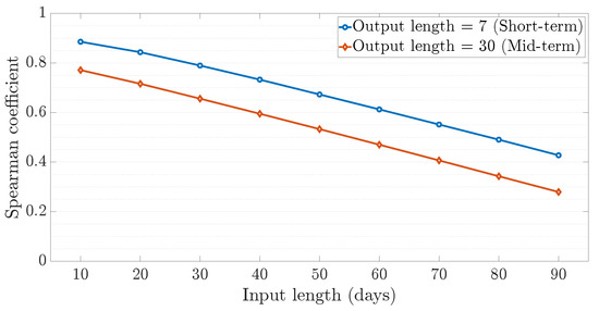 Specifically, the proposed BiLSTM model consistently achieved the best performance in this case ( and time) for both seasons and forecasting horizons. In particular, BiLSTM achieved the highest overall average improvements compared with the first case (i.e., time only), with for short-term horizons and for mid-term horizons in terms of the RMSE, MAPE, and CV metrics. TST and InceptionTime followed BiLSTM with smaller improvements, where TST achieved average improvements of for short-term forecasting and for mid-term forecasting for the same metrics and over all seasons. InceptionTime achieved average improvements of for short-term forecasting and for mid-term forecasting for the same metrics and seasons. In addition, both of these models appeared to struggle to efficiently assimilate patterns from the decomposed sequences and accurately forecast SIV anomalies, yielding ACC averages that were consistently less than for TST and for InceptionTime for all considered input cases. A variety of factors contributed to these lower performance values. For instance, although it incorporates a multihead self-attention mechanism that can process past and future information in the input, TST usually requires a larger amount of training data than that required by LSTM to learn the underlying patterns and make accurate predictions. Nonetheless, these results emphasize the importance of the BiLSTM network’s memory cells in capturing and retaining long-term information from the input.