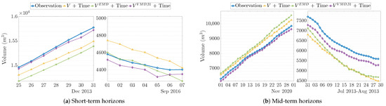 The best performance was achieved using the VMD-processed inputs (i.e., and time). Similar to the second case (i.e., volume and time), all models could better learn the variations in the SIV. Particularly, compared with the same second case, overall average improvements of , , , , and were achieved in terms of the RMSE, MAPE, CV, AC, and SS over all the forecasting horizons, seasons, and models. These results showcase the capabilities of VMD in capturing intrinsic time-frequency patterns, which is essential for better forecasts. Similar to the and time case, better overall performance was observed with longer forecasting horizons. In particular, the overall average improvements for short-term forecasting were , , and in terms of the RMSE, MAPE, and CV during fall/winter and , , and during spring/summer over all three models. Mid-term forecasting saw overall average improvements of , , and during fall/winter and , , and during spring/summer in terms of the RMSE, MAPE, and CV over all three models. Nevertheless, higher errors were associated with longer horizons.