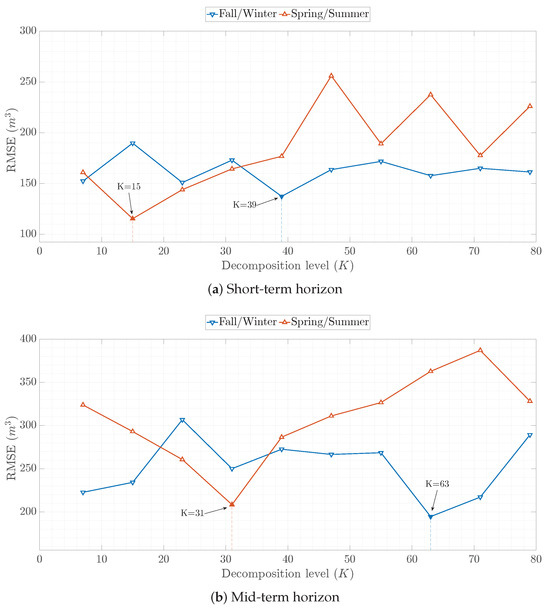 Forecasting longer horizons generally necessitated higher VMD decomposition levels. The forecasting performance was improved with a smaller value of K for short-term forecasting, with and for the fall/winter and spring/summer seasons, respectively. Almost double those values were needed for mid-term forecasting, with and for the fall/winter and spring/summer seasons, respectively. This observation can be attributed to the increased uncertainty related to increased forecasting horizons. Thus, further horizon forecasting requires more detailed time-frequency patterns that can be extracted using VMD to achieve optimal performance.