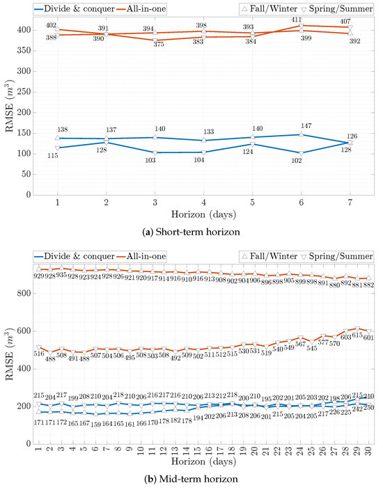 From Table 7 and Figure 10, it is apparent that using the “divide and conquer” strategy produced better overall forecasting performance compared to the “all-in-one” strategy. Particularly, average degradations of , , and in terms of the RMSE, MAPE, and CV were observed, regardless of the forecasting horizon and season. These results provide empirical proof of the usefulness of dividing the forecasting task into sub-forecasting tasks using separate deep learning models. Moreover, the errors over each horizon showcase how the model using the “all-in-one” strategy struggled to deal with the increased uncertainty in further horizons (e.g., mid-term forecasting during the spring/summer season). Although a similar observation can be made for the other case, it was significantly attenuated, as minor errors accumulated over the horizons. Such outcomes prove that dividing the forecasting task into specific and separate tasks can reduce the related uncertainty and generate more accurate forecasts.