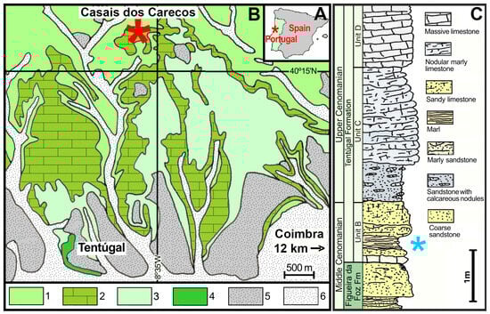 The shallow-water sequence of “Unit B” is overlaid by a transgressive surface with a set of nodular marly carbonates, with a rich and diverse carbonate shelf fauna (“Unit C”) (Figure 1C). These beds yield an early late Cenomanian ammonite assemblage with Neolobites vibrayeanus and Calycoceras naviculare [,,,,,]. The succession continues upwards with a bed of whitish massive limestones, packstone to grainstone (“Unit D”), with abundant fragments of scleractinian corals, mollusks, and the echinoid Anorthopygus michelini (Figure 1C). Outside the quarry area (Figure 2), the Tentúgal Fm finishes with a few meters of greyish marls with nodular limestone layers (“Units E and F”), where a middle upper Cenomanian assemblage of Tethyan ammonites with Vascoceras gamai can be recognized [,,].