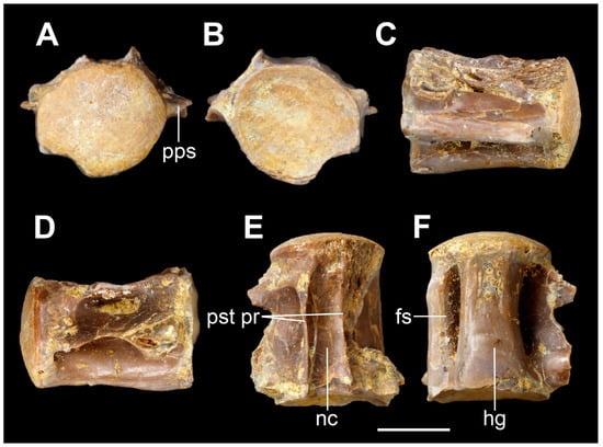 Obaichthys africanus Grande []; vertebral centrum DCT-CC-19 from Beiraterra quarry vertebrate fossil site, Casais dos Carecos, Coimbra (Baixo Mondego region of West Portugal). (A–F) Anterior (A), posterior (B), right lateral (C), left lateral (D), dorsal (E), and ventral (F) views. Abbreviations: fs, lateral fossa; hg, hemal groove; nc, neural canal; pps, parapophyses; pst pr, longitudinal parasagittal ridges. Scale bar = 0.5 cm.