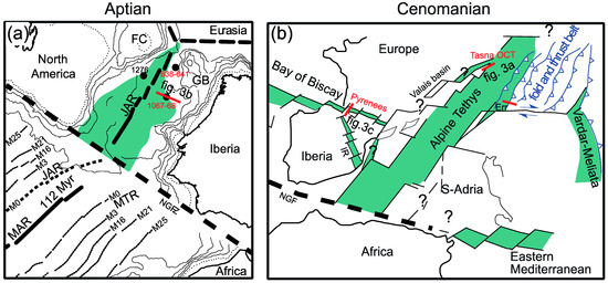 Paleogeographic maps showing the locations of the studied examples at the moment of breakup, when basins were not fully connected to the global oceans. Green polygons mark hyperextended domains where the mantle was exhumed at the seafloor. (a) Paleogeographic map of Newfoundland–Iberia at Aptian time. FC: Flemish Cap, GB: Galicia Bank, JAR: J-Anomaly Ridge; NGFZ: Newfoundland–Gibraltar Fracture Zone (NGFZ). Dots mark the ODP Sites and a red line marks the seismic section used in this work. Map modified from Tucholke and Sibuet [27]. (b) Paleogeographic map of the Alpine Tethys and the Pyrenean domain between Iberia and Europe. The red lines are the sections from Mauléon Basin and Tasna OCT. IR: Iberia Internal Range. See also the location of the Err detachment system at the distal Adriatic margin. Map modified from Manatschal and Müntener [28].
