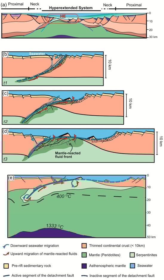 Relationship between the evolution of a hyperextended system and fluid flow. (a) Location of the hyperextended system (HE). Red square marks HE and fluid evolution shown from (b–e). Note that the time steps of the evolution of the detachment fault system and fluid flow are indicated by t1–t3. (b) The fault system cuts through the already thinned continental crust into the mantle, triggering serpentinization. (c) Mantle exhumation along active detachment systems. Deformation of the continental crust, together with fluid flow, also results in its alteration (saussuritization). (d,e) Mantle exhumation and simultaneous serpentinization. Fluids migrate upward along active extensional detachment faults towards the seafloor, where they can either react with sediments or pollute seawater. (e) Schematic lithosphere at the time of mantle exhumation. Subfigures (b–e), modified from [4].
