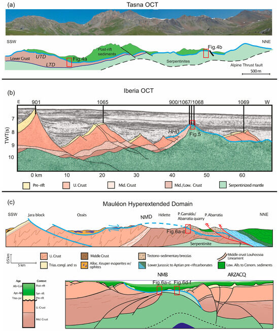 Hyperextended domains. (a) Photo of Tasna OCT at the top and its interpretation below. UTD: Upper Tasna Detachment; LTD: Lower Tasna Detachment. After [39,40]. The location of Tasna outcrop is 46.82° N/10.25° E. (b) Reflection seismic section Lusigal-12 at the Iberia margin. HHD: Hobby High Detachment (location at 40.6° N/11.6° W). The numbers at the top are the ODP Sites. (c) Geological section at the top, from the breakaway fault (Jara) to the most distal segment of the North Mauléon Detachment (NMD). The red lines are thrust faults formed during Pyrenean convergence. Although the serpentinites do not outcrop at the surface in this section, a mantle outcrop occurs a few kilometers further west. The section below shows the reconstruction of the hyperextended system (modified from Masini et al. [35]). Location: Jara block (43.19° N/1.29° W) and Pic de Garralda (43.34° N/1.24° W).