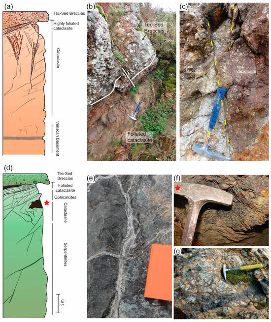 Sections across the fault zone of the North Mauléon Detachment (NMD) and the exhumed mantle. (a) Fault zone profile across the NMD. (b) Outcrop at the Pic de Garralda showing the low-angle contact (015/45) between foliated cataclasites and tectono-sedimentary breccias. (c) The fault zone is made of cataclasites cut by secondary sub-vertical normal faults (dashed lines) at the Abarratia query (see Figure 3c for location). The reddish color in previous photos highlights the presence of Fe-oxides. (d) Fault zone profile across the top of the exhumed mantle. Note the Fe-oxide layer at the serpentinites (red star). (e) Calcite veins cut the serpentinites. (f) Fe-oxides crust formed in the serpentinites. See the red star for location in (d). (g) Veins of Fe-oxyhydroxides in the Triassic sedimentary rocks from the breakaway of NMD.