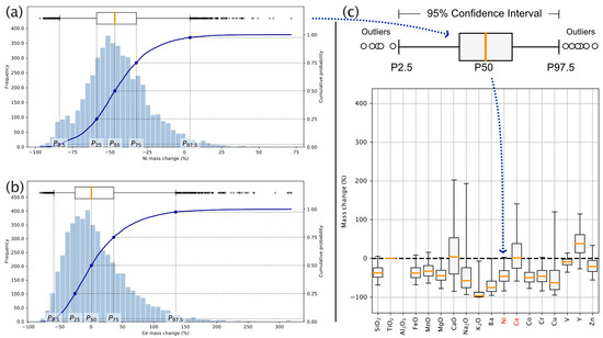 Reading the bootstrap results. An example of how to read the results is shown based on the serpentinization result. Subfigures (a,b) are detailed species (Ni and Ce) distributions, showing the probabilities of gain and losses. Note the confidence interval (black box with orange line centered in P50. Subfigure (c) shows only the confidence interval (without outliers) for each species, allowing for us to plot all species in one chart for an overall analysis. Note the dotted blue arrow showing the extraction of each confidence interval (e.g., Ni and Ce) from (a,b) which allow to build the mass change chart (c). Note Ni and Ce with red letters in (c). The range spanned by the whiskers represents the 95% confidence interval, while the black box marks the 50% confidence interval. Serpentinization will most likely result in a loss in probability distribution such as Ni (a), where the confidence interval is far from zero. On the other hand, when the confidence interval is fairly centered around zero, mass changes are not statistically relevant in the serpentinization process, such as Ce (b). See the text for explanations.