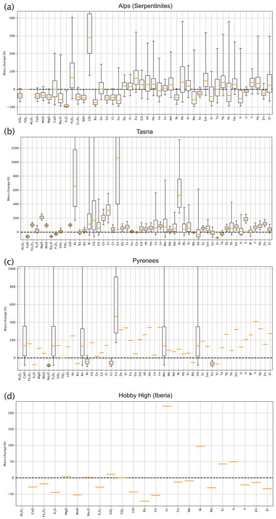 Gain and loss of elements in mantle and continental crust rocks. The diagrams show the gains and losses of species (i.e., chemical elements and compounds) related to transformation (alteration) from protoliths to altered rocks. Protoliths are unaltered/weakly altered continental crust rocks, or less deformed fault rocks and peridotites, or weakly serpentinized peridotites. Altered rocks are fault rocks over the continental crust and serpentinized peridotites. Orange lines are P50 (see Figure 7 ofr explanation) or in some cases, when the mass balance is performed with one protolith and one altered rock, they represent the deterministic result (i.e., without statistic calculation). (a) Gain and loss related to peridotite and serpentinite alterations. Note the loss of species such as Ni, Cr, V, Si, Mg, Ca, Fe and Mn below the zero-mass change. (b–d) is the gain and loss from the basement of the continental crust to fault rock. Note that species such as Ni, Cr and V, which are lost during peridotite and serpentinite alterations, are the same species gained in fault rocks from extensional detachment systems in the continental crust. Data from Table 1. (b) Mass change assuming granite from Middle Err as a protolith and cataclasites and gouges as altered rock from the UTD at Tasna OCT. (c) Mass change from paragneisses to cataclasites from Pic de Garralda (Mauléon Basin). (d) Mass change from HHD-1 (cataclasites) to HHD-2 (gouge/fault breccia) in the Hobby High Detachment at Iberia OCT. We used Table 1 to present the geochemical data from fault and continental crust basement rocks, and published data from [70] and [4] for serpentinized peridotite rocks.