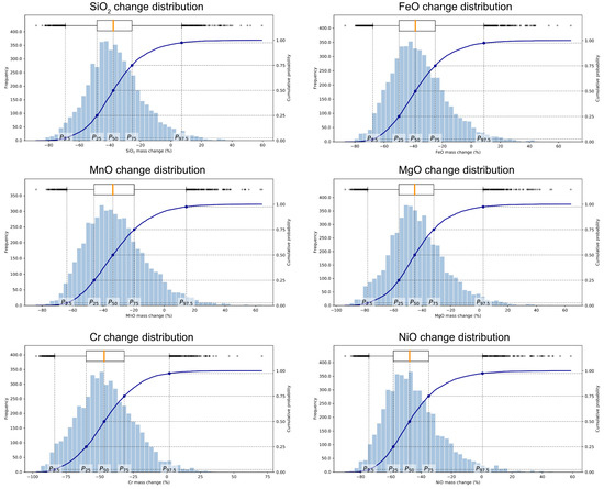 Figure 8a shows the total gain and loss of elements from weakly to moderate and highly serpentinized rocks. This chart is the result of the bootstrap method, considering Al2O3 and TiO2 as an immobile reference frame (option B from Ague and Van Haren [72]; see Supporting Information for details). The choice of Al2O3 and TiO2 is based on previous mass balance studies of similar rocks from the Err detachment system [4]. The use of these elements as “immobile” provides results coherent with petrological and mineralogical observations (for discussions, see [4,74]). The horizontal line at a percentage of zero marks the level of no mass change. Species below and above that horizontal line show losses or gains, respectively. In these charts, Si, Mg, Ca, Fe, Mn, and the trace elements Ni, Cr and V are some of the main elements lost during the alterations in the subcontinental peridotites along the OCT of the Alpine Tethys. In Figure 8, some elements can be seen as loss and gain, depending on the pairs of protolith/altered rock considered in the 5000 Monte Carlo realization, which can be also seen as the stage of alteration. Note that the peridotites from the OCT in the Alps are more enriched than those from MORs. Figure 9 details mass change histograms for these species, with the 95% confidence interval dominated by losses. In many examples, the P50 is between −45% and −35%, as is the case of SiO2, MgO, FeO, MnO, Cr and Ni. The loss of elements, particularly those elements characteristic of the mantle, which are rarely found in continental basements (e.g., Cr, Ni and V), enables us to use them as tracer elements for mantle-reacted fluids (see also [4]). A possible origin from extrusive magmatic rocks can be excluded, since such rocks do not exist in the studied areas.