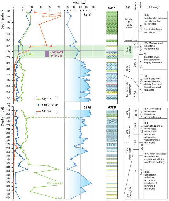 At the ODP Site 641C, in the Barremian to Early Aptian section, there were no large discrepancies between Sr/Ca, Mg/Sr and CaCO3 trends (Figure 10). Likewise, the Mn/Fe ratio changes very little. However, sedimentary rocks from Early Aptian to Late Aptian-Early Albian record an increase in the Mg/Sr ratio (higher Mg content), while CaCO3 values decrease significantly. This is accompanied by a higher Mn/Fe ratio. The observed increase in Mg and Mn contents is not related to facies variation, since the Aptian sedimentary sequence comprises carbonate marlstones and thin limestones. At the same interval, and as a single level (e.g., ~10 m-thick section 641C-8R-CC to 9R-2), silicified carbonates and authigenic quartz pore-filling cements are described to be enriched in Fe and Mn [81]. Therefore, it is necessary to evoke an external source, different from the detrital one, in order to explain such enrichments and silicification in this specific sedimentary section.