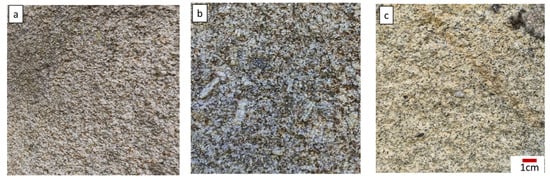 Different types of granite in walls of churches. (a) Granite with two micas of fine–medium grain in San Martiño de Noia Church. (b) Granite of two medium-grain micas in Church of San Xoan de Macenda; plagioclase phenocrysts are visible. (c) Fine-grained variant; Church of Santa Maria de Ribasieira.