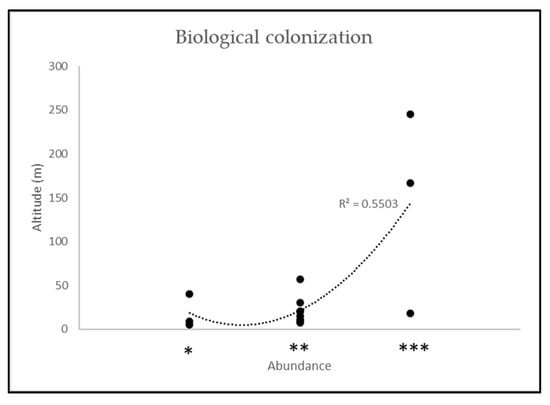 The in situ observations of the studied buildings reveal different patterns of deterioration, as expected []. Damages ranging from just aesthetic to structural damages have been identified. In general, the most frequent decay consists of biological colonization, discoloration, coating, and detachment, but dark crusts and salt efflorescences are also observed in some cases (Table 2), in agreement with the most common decay patterns observed in other monuments previously studied in the NW Iberian Peninsula [,]. The comparison did not include the façade orientation, which could be important for assessing climatic and seaside effects. It seems that biological colonization exhibited trends of exponential abundance with altitude (Figure 4).