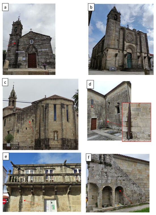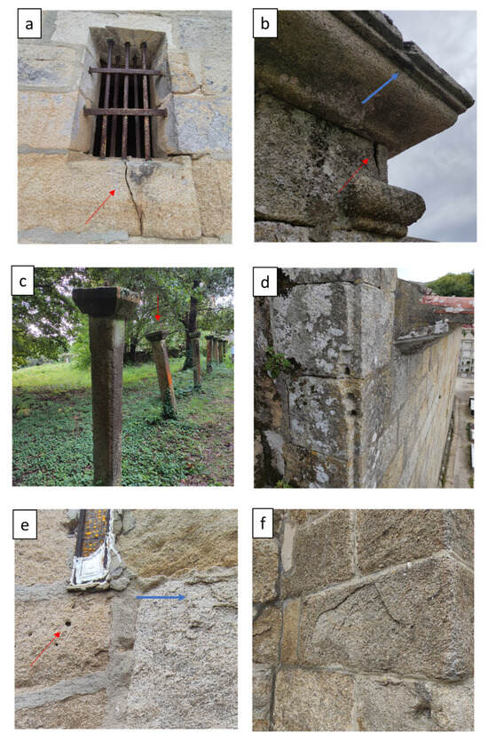 (a) Cracking in Church of San Cristovo de Abanqueiro; (b) crack (red arrow) and missing part (blue arrow) in Church of Santa Maria de Caamaño; (c) deformation in exterior columns of Pazo de Goians; (d) gaps (red arrow) and differential erosion (blue arrow) in Church of San Cristovo de Abanqueiro; (e) delamination in Church of San Martiño de Noia; (f) gaps in Church of Santa Maria de Caamaño.
