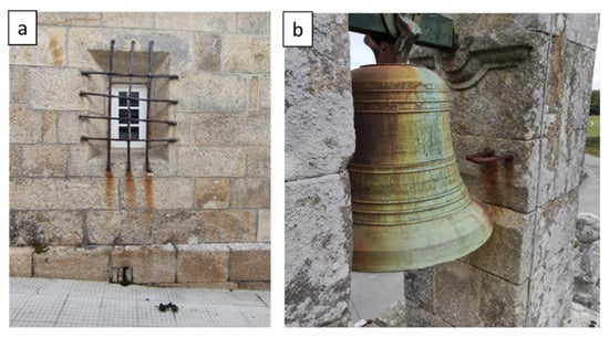 Moreover, there are monuments that show chromatic alterations due to discoloration. The chromatic alterations and coatings observed on these monuments are closely associated with the chemical process of weathering of the minerals, and they are localized in specific areas of some façades exposed to this process. Moreover, there is extrinsic metallic staining in other materials and structures due to corrosion, especially that of iron, copper, and alloys (Figure 7a,b).