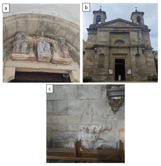 The Barbanza Peninsula includes a lithological variety (Figure 2). Among the types of granites, the one with the greatest representation is a granite with two micas of medium–coarse grain, called the Barbanza type, the majority in the entire central sector. In the Corrubedo area (SW), this is transformed into a fine-grained variant. Examples of churches with Barbanza-type granite are the churches of San Xoán de Macenda or Santa Maria de Ribasieira (Figure 3).