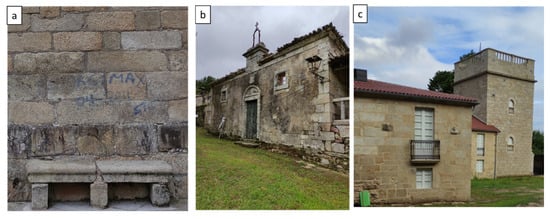 Finally, graffiti (Figure 10a), which is considered a form of aesthetic deterioration caused by anthropogenic action, was also observed very locally in some churches (like San Martiño de Noia or Santiago da Pobra do Dean). However, the effort to recover cultural heritage was also observed in some monuments such as the Pazo de Goians (Figure 10b,c); here, the tower and main building have undergone maintenance in the last three years, and the recovery work on the chapel (currently in ruins) and rest of zones are future proposals projected in the medium–short term.