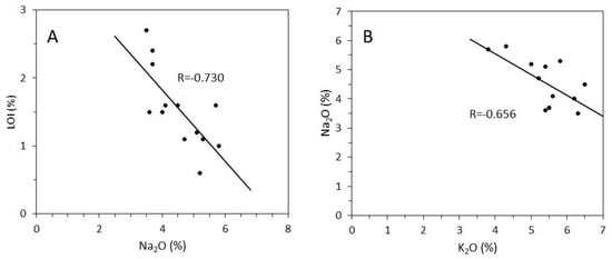 Linear correlation between some of the analyzed elements related to salts. Na vs. LOI (A) and for K vs. Na (B).