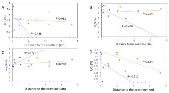 LOI (A) and concentrations of K2O (B), Na2O (C), and P2O3 (D) in relation to distance from the coast for buildings in the two areas considered in this study.