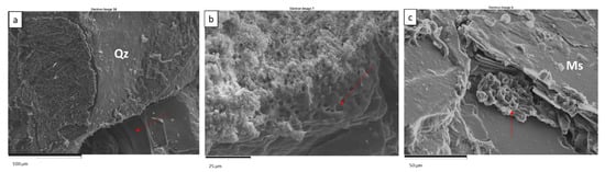 SEM micrographs of the granite surface of the Church of Santa Baia de Boiro displayed several deterioration features such as dissolution (Figure 14a), corrosion pits in the feldspar grains (Figure 14b), and salt precipitates (Figure 14c) covering the minerals that form this rock, quartz, plagioclase, feldspar, and micas.