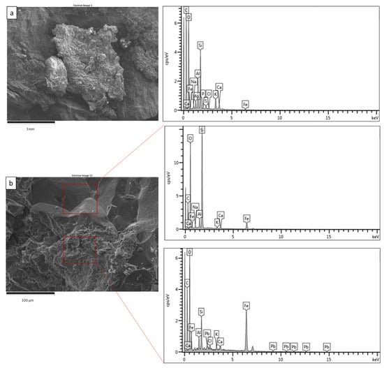 SEM-EDX of Church of Santa Baia de Boiro. (a) Weathered plagioclase crystal with precipitation of phosphates, sulfates, carbonates, and chlorides. (b) Weathered plagioclase crystal with chloride and carbonate crust. The presence of lead (Pb) is detected.