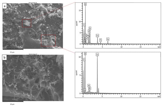 SEM-EDX of Church of Santa Maria de Ribasieira. (a) EDX above shows mica crystals with Fe-Ti oxide particles. On the other hand, calcium carbonate crusts are detected in the lower part. (b) SEM micrograph with presence of biological colonization.
