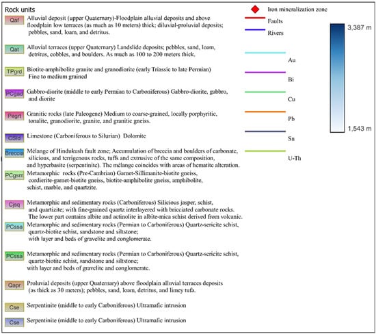 Figure 1 presents the spatial distribution of geological formations, encompassing various rock types across the area of interest. This illustration likely visually represents the geological diversity and distribution within the geological map. In the western central region of the map, specific zones with a higher concentration of iron are highlighted. These zones are associated with rock formations characterized by metamorphic and sedimentary rocks from the carboniferous period. These formations include various rock types, such as siliceous jasper, schist, and quartzite. Within these rock layers, there are occurrences of fine-grained quartz interlayered with brecciated carbonate rocks. Various geological materials are accumulated in the southeastern region of these iron-bearing zones. That includes the presence of breccia and large boulders composed of carbonate, siliceous, and terrigenous rocks. Additionally, there are deposits of tuffs and extrusive formations with similar compositions. Along the Hindukush fault zone within this area, hyperbasite rock types, particularly serpentinite, are prevalent.